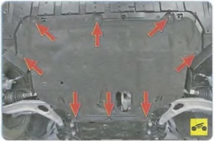20. Выверните восемь винтов крепления брызговика двигателя...