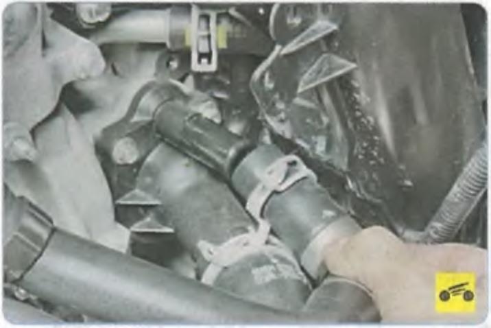 54. Ослабьте хомут крепления отводящего шланга радиатора, сжав пассатижами его отогнутые ушки...