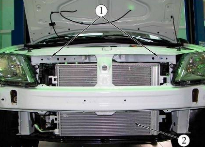 Отвернуть верхние болты 1, рисунок 4-9, крепления кронштейна радиатора к кузову автомобиля (головка сменная 10, удлинитель, вороток трещоточный).