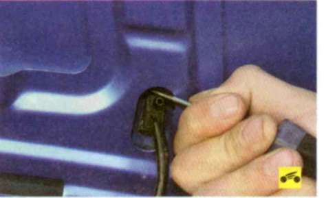 11. ...поддев отверткой, отсоедините держатель жгута проводов и шлангов омывателя с правой стороны капота и отведите жгут и шланги в сторону.