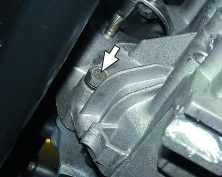 17. Ослабьте болт нижнего переднего крепления коробки передач к блоку цилиндров, воспользовавшись воротком с насадкой на 19 мм.