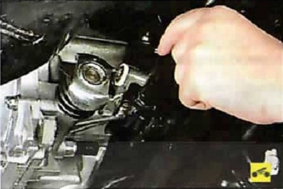 8. Отверните гайку оси крепления тяги выбора передач к втулке механизма выбора...