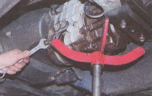 7. Если помощника нет, для подстраховки под коробку передач устанавливаем гидравлический домкрат или регулируемую опору.