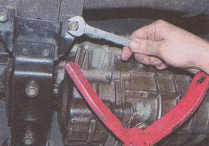 8. Ключом «на 19» отворачиваем четыре гайки крепления коробки передач к картеру сцепления.