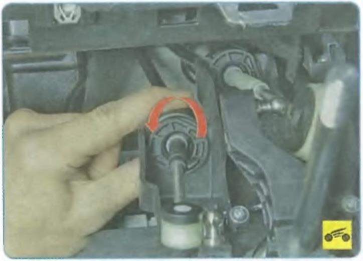 29. Поверните против часовой стрелки фиксатор наконечника оболочки троса выбора передач и извлеките наконечник оболочки из кронштейна кулисы рычага управления коробкой передач.