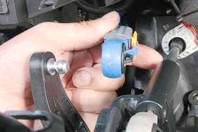 7. Аналогично отсоедините наконечник троса переключения передач от рычага кулисы и наконечника его оболочки от кронштейна кулисы.