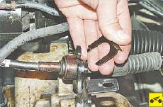 9. Захватите пассатижами край пружинной скобы крепления наконечника оболочки троса выбора передач. Сдвиньте ее вверх.