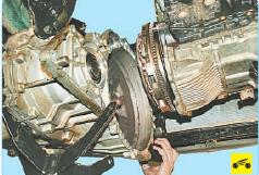 Коробка передач довольно тяжелая и имеет неудобную для удержания форму, поэтому рекомендуем снимать ее с помощником.