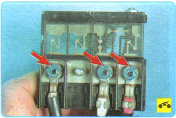 9. ...и три нижние гайки крепления силовых проводов и снимите блок предохранителей.