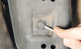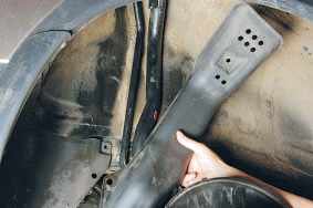 14. Откройте крышку люка наливной трубы топливного бака и, придерживая в арке заднего колеса наливную трубу, выдавите ее внутрь кузова.
