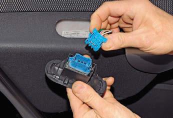 Нажав на фиксаторы колодки жгута проводов, отсоединяем ее от выключателя электростеклоподъемника.