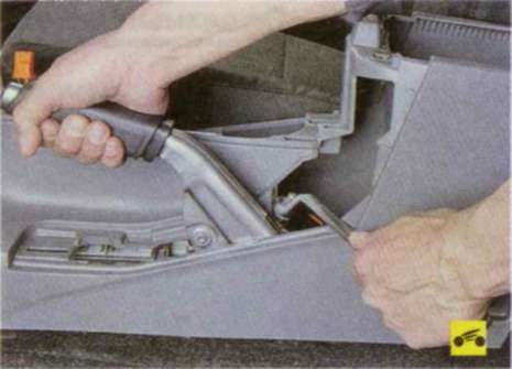 9. ...подденьте отверткой край облицовки снизу около чехла стояночного тормоза...