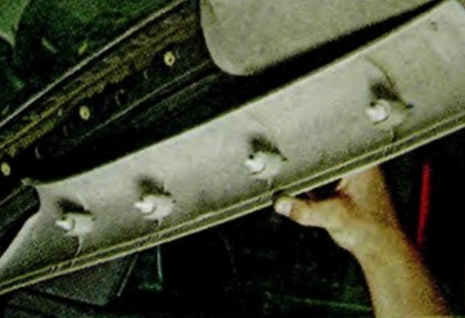17. Подденьте отверткой и извлеките два пластмассовых пистона крепления верхней части задней облицовки порога к кузову.
