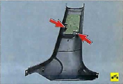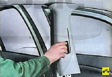 1. Снимите верхнюю облицовку передней стойки кузова, преодолевая сопротивление ее держателей.