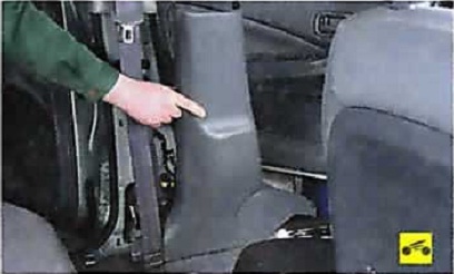 7. Снимите нижнюю часть облицовки центральной стойки кузова, потянув ее вбок и преодолевая сопротивление держателей ее крепления.