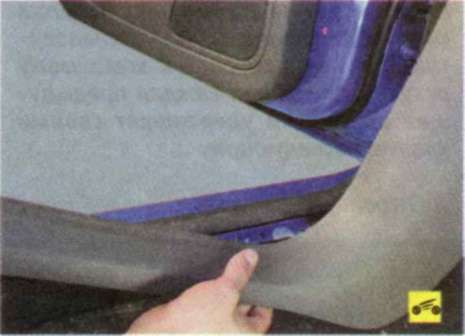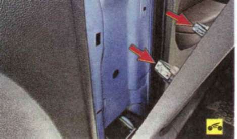 6. Откиньте вперед спинку заднего сиденья и отведите задний край нижней части облицовки задней стойки настолько, чтобы верхний пистон ее крепления вышел из отверстия в кузове.