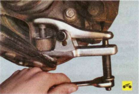 Отсоедините толкатель вакуумного усилителя тормозов от педали тормоза. Выжмите педаль тормоза. Отожмите зажим.