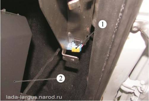 11. Извлечь заглушку из центральной консоли панели приборов или радиоприемник с проигрывателем компакт-дисков 2, отсоединить колодки жгутов проводов и антенну (съемник радиоприемника и проигрывателя компакт-дисков).