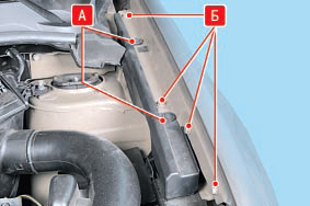 Расположение пистонов А крепления декоративной накладки боковины крыла и болтов Б верхнего крепления крыла к кузову.
