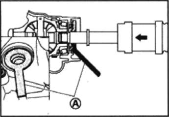 • Чтобы не повредить сальник при установке приводного вала поставьте защиту (А) (специнструмент: KV381079000) на коробку передач. Вставьте скользящий шарнир приводного вала и надежно установите, постучав молотком.