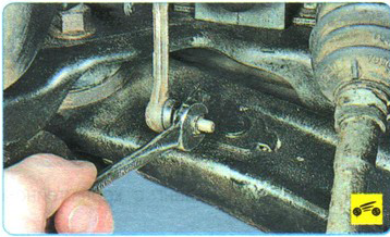 14. Отверните гайку крепления пальца стойки стабилизатора и отсоедините от штанги стабилизатора палец шарнира стойки стабилизатора.