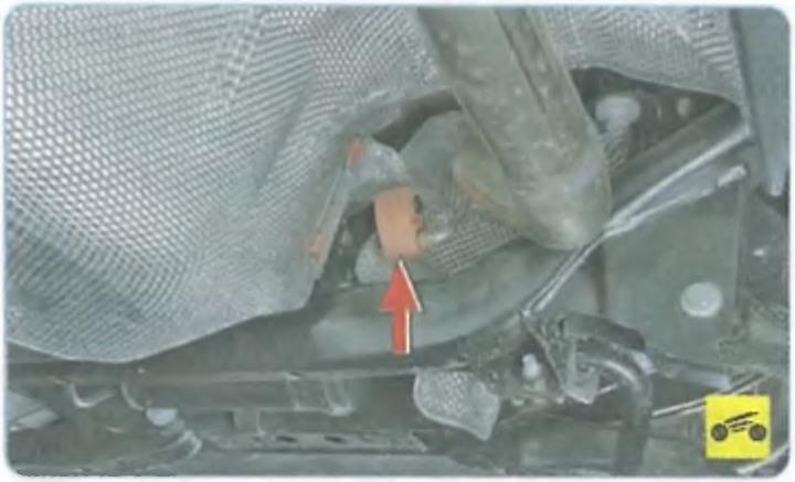 11. Подденьте отверткой и снимите с кронштейна поперечины задней подвески подушку подвески системы выпуска отработавших газов.