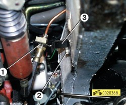 При отсутствии нового уплотнительного кольца рабочий цилиндр можно снять вместе со шлангом. Для этого отсоедините тормозную трубку от наконечника 1 шланга, отвернув штуцер трубки. Выверните болт крепления 2 и отсоедините кронштейн 3 от кузова.