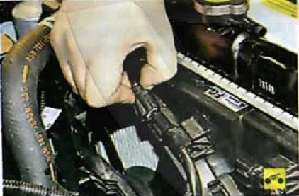 10. Ослабьте хомут крепления подводящего шланга радиатора, сжав пассатижами его отогнутые ушки, сдвиньте хомут по шлангу.