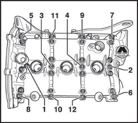 21. Установить новые болты крепления, и затянуть их равномерно накрест с внутренней стороны крышки к наружной. Убедиться в том, что крышка головки блока цилиндров не перекосилась при установке. Момент затяжки болтов крепления: 10 Н-м + повернуть дополнительно на 90° (1/4 оборота).