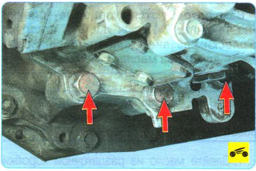16. Выверните три болта нижнего крепления раздаточной коробки к картеру коробки передач.