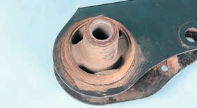 19. Деформированный кронштейн замените. Осмотрите резинометаллические шарниры (сайлентблоки) кронштейна переднего крепления редуктора заднего моста. При наличии вспучивания, растрескивания массива резины, отслоения его от стальной обоймы или при образовании трещин в обойме замените кронштейн передней подвески.