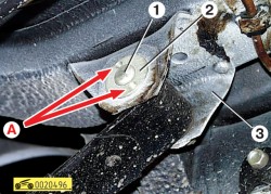 5. Отцентрируйте при необходимости палец 1 и шайбу 2 с отверстием кронштейна 3. Вверните два технологических болта в резьбовые отверстия А шайбы пальца. Обильно смочите втулки и палец мыльным раствором или тормозной жидкостью. Вставьте между технологическими болтами монтировку или мощную отвертку и, проворачивая палец в обе стороны, добейтесь свободного проворачивания пальца во втулках. Наверните гайку на палец 1 заподлицо с его торцом и ударами молотка выбейте палец до касания гайки кронштейна 3. Отверните гайку и выбейте окончательно палец бородком, прикладывая усилие к торцу пальца. Выведите передний конец рессоры из кронштейна.