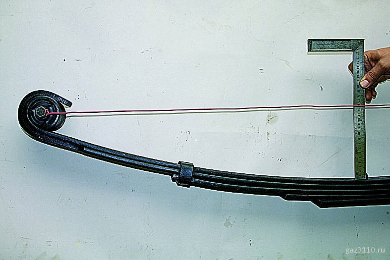11. Проверьте стрелу прогиба рессоры. С обоих сторон автомобиля стрела прогиба должна быть одинаковой. Разность размеров стрелы прогиба одноименных рессор, устанавливаемых на автомобиль, не должна превышать 10 мм.