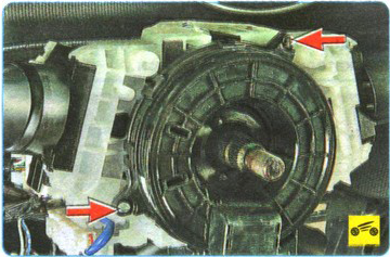 16. Выверните два винта крепления контактного кольца к держателю подрулевых переключателей,..