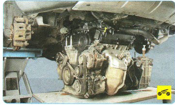 Снимайте двигатель в сборе с коробкой передач, опуская его вниз из моторного отсека. Для этого необходим грузоподъемный механизм или подъемник.