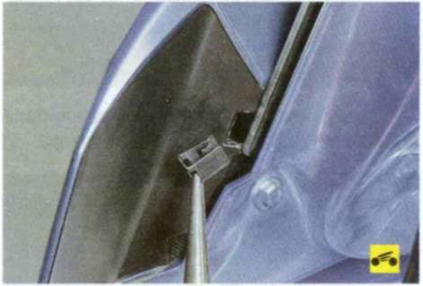 4. Снимите два пружинных держателя спойлера, расположенные по его краям слева и справа, и отведите спойлер от двери.