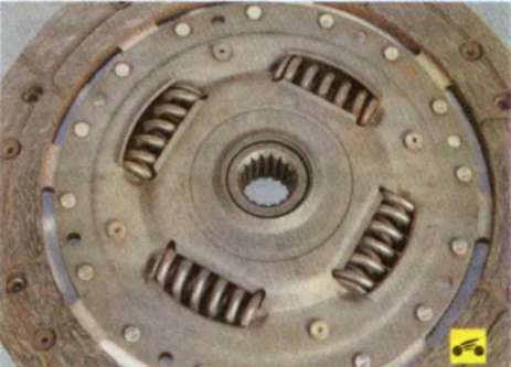 7. Проверьте надежность фиксации в гнездах ступицы ведомого диска демпферных пружин, пытаясь переместить их в гнездах ступицы рукой. Если пружины легко перемещаются в гнездах или сломаны, замените диск.
