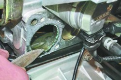 18. Очистите привалочную поверхность головки блока цилиндров и фланец корпуса термостата Чери Амулет от остатков прокладки.