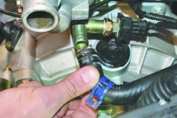6. Сожмите пассатижами его отогнутые ушки, сдвиньте хомут по шлангу, и отсоедините шланг от патрубка корпуса термостата.