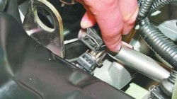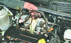 5. Отсоедините колодки жгута проводов от датчиков детонации, концентрации кислорода в отработавших газах, положения дроссельной заслонки, температуры и давления воздуха во впускном трубопроводе, температуры охлаждающей жидкости и от регулятора холостого хода и отведите жгут проводов от двигателя.
