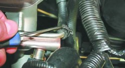 6. Разъедините замок хомута крепления топливного шланга к штуцеру топливной рампы...