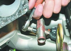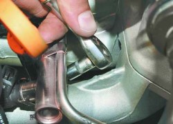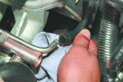 Полезный совет: При отсоединении топливного шланга от штуцера топливной рампы положите под место соединения ветошь, чтобы она впитала остатки топлива, которые могут вытечь из рампы и шланга.