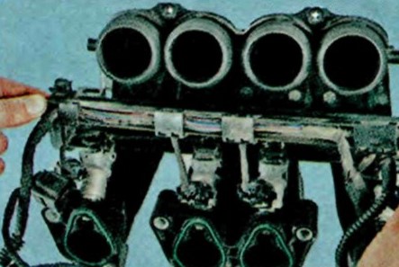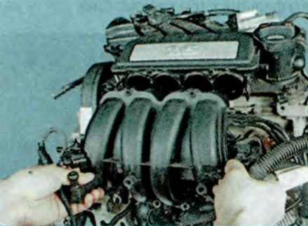 14. Снимите топливную рампу, форсунки из отверстий впускного коллектор.