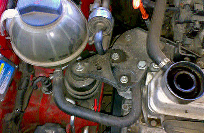 10. Ослабьте хомут патрубка помпы снизу (показан стрелкой) и открутите металлическую трубу антифриза от блока (маленький болтик, откручивается звездочкой). Стините патрубок с помпы.