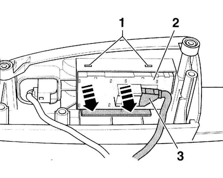 2. Освободите небольшой отвёрткой (стрелки) стопорные крючки и выньте выключатель регулировки наружного зеркала вниз из обивки двери.