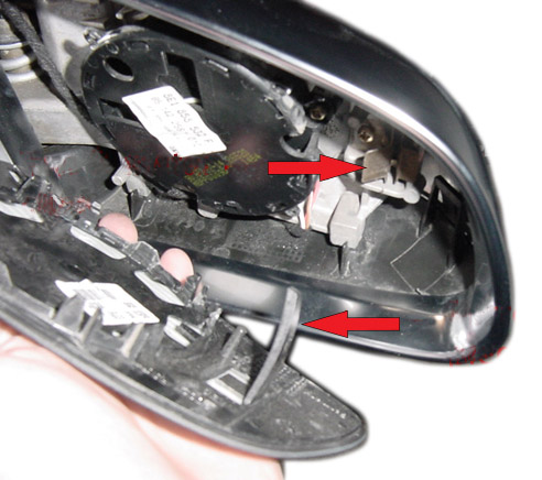 3. Отсоедините корпус наружного зеркала (1) из держателей (стрелки) и снимите наверх.