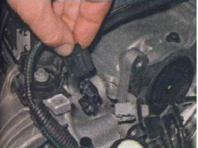 Надавить пальцами на фиксатор штекера кабеля системы управления двигателем, а затем отсоединить штекер от гнезда на датчике распредвала.
