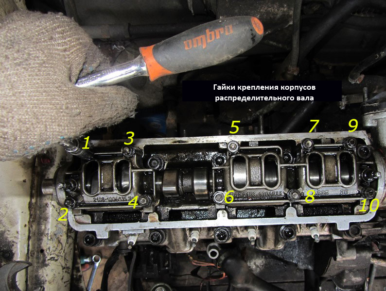 9. При помощи головки на 13 мм равномерно в несколько приемов (до снятия давления пружин клапанов) отверните десять гаек крепления корпусов подшипников распределительного вала.