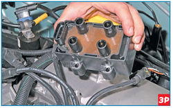 1. При выключенном зажигании отжимаем фиксатор колодки жгута проводов системы управления двигателем и отсоединяем колодку жгута проводов от катушки зажигания.