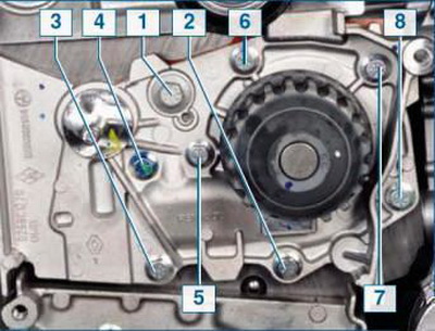 Последовательность затяжки болтов крепления насоса охлаждающей жидкости.